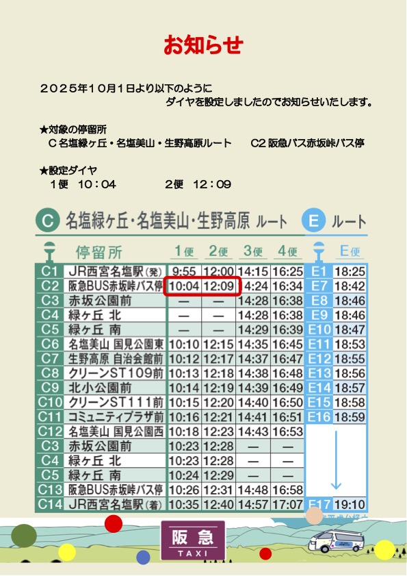 Cルート:JR西宮名塩駅⇔名塩赤坂・名塩緑ヶ丘・名塩美山・生野高原